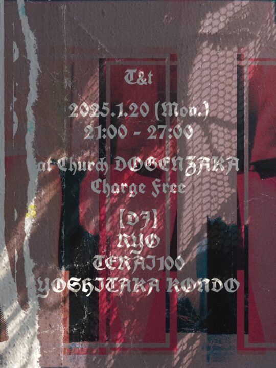 [ 入場無料 ] T&t2025年1月20日|By church 2025年1月20日 1/20 (Mon) T&t [ DJ ] RYO TERAI100 YOSHITAKA KONDO [ TimeTable ] 20:00 – OPEN 21:00 – START 03:00 – BarTime 05:00 – CLOSE [ System ] Entrance FREE