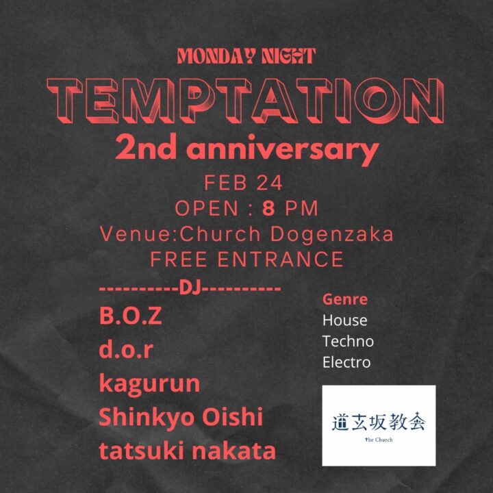 [ 入場無料 ] TEMPTATION2025年2月21日|By church 2025年2月24日 2/24 (Mon) TEMPTATION [ DJ ] B.O.Z d.o.r kagurun Shinkyo Oishi tatsuki nakata [ TimeTable ] 20:00 – OPEN / START 05:00 – CLOSE [ System ] Entrance FREE