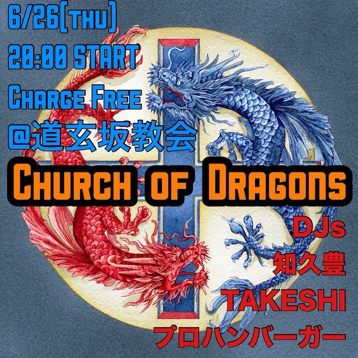 [ 入場無料 ] CHURCH of DRAGONS2025年6月19日|By staff 2025年6月26日 6/26(Thu) CHURCH of DRAGONS [ DJ ] 知久豊 TAKESHI プロハンバーガー [ TimeTable ] 20:00 – OPEN / START 03:00 – BarTime 05:00 – CLOSE [ System ] Entrance FREE