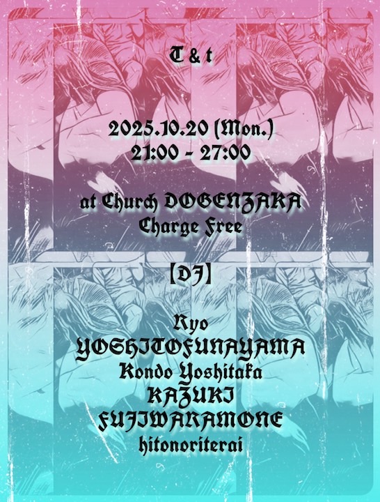 [ 入場無料 ] T & t2025年10月16日|By staff 2025年10月20日 10/20(Mon) T&t [ DJ ] Ryo YOSHITOFUNAYAMA Kondo Yoshitaka KAZUKI FUJIWARAMONE hinotoriterai [ TimeTable ] 20:00-OPEN 21:00-START 3:00-Bar Time 5:00-CLOSE [ System ] Entrance FREE