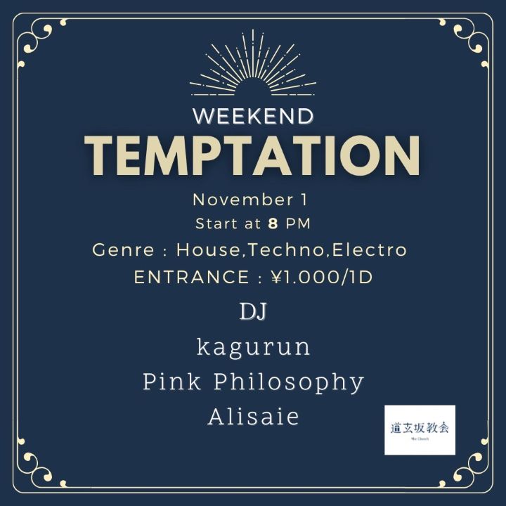TEMPTATION2025年10月31日|By staff 2025年11月1日 11/01(Sat) TEMPTATION [ DJ ] kagurun Pink Philosophy Alisaie [ TimeTable ] 20:00 – OPEN / START 05:00 – CLOSE [ System ] ¥1,000 – Include 1drink