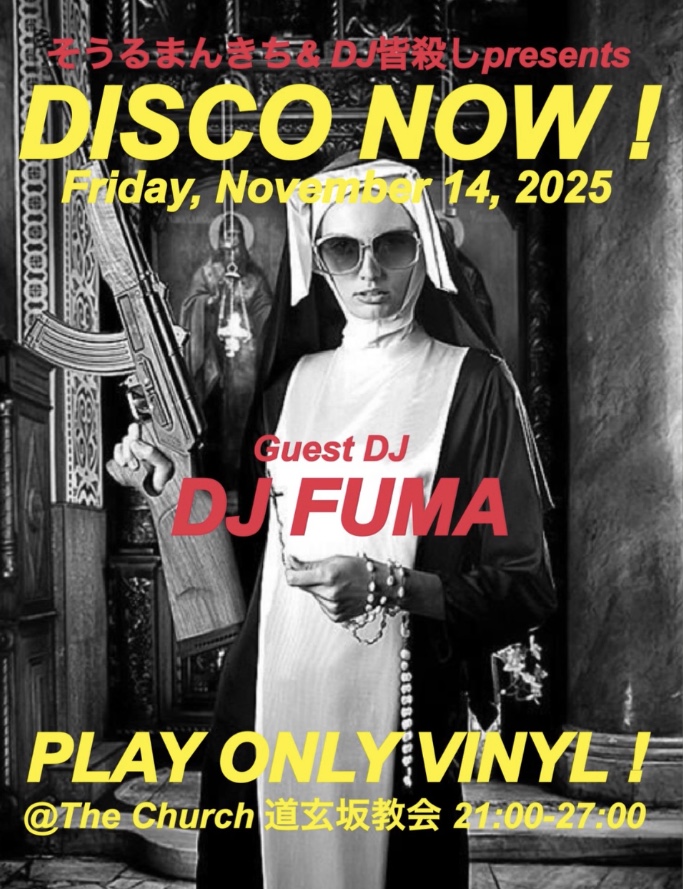 DISCO NOW !2025年11月14日|By staff 2025年11月14日 11/14(Fri) DISCO NOW ! [ DJ ] そうるまんきち DJ 皆殺し – Guest DJ – DJ FUMA [ TimeTable ] 20:00 – OPEN 21:00 – START 03:00 – BarTime 05:00 – CLOSE [ System ] ¥1,000- Include 1drink