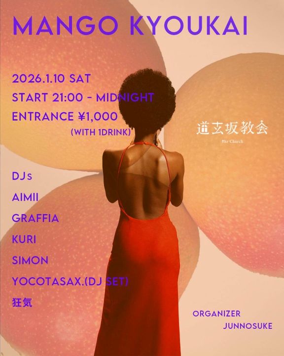 MANGO KYOUKAI2026年1月6日|By staff 2026年1月10日 01/10(Sat) MANGO KYOUKAI [ DJ ] AIMII GRAFFIA KURI SIMON YOKOTASAX. (DJ SET) 狂気 [ TimeTable ] 20:00 – OPEN 21:00 – START 03:00 – BarTime 05:00 – CLOSE [ System ] ¥1,000 Include 1drink