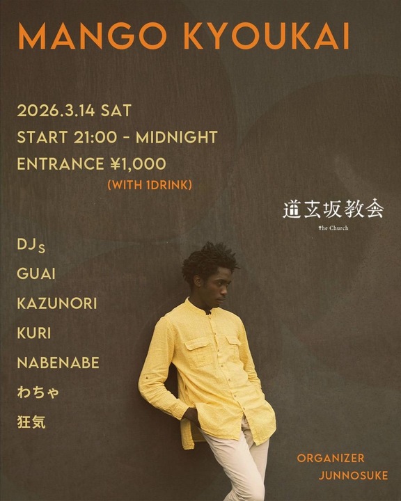 MANGOKYOKAI2026年3月5日|By staff 2026年3月14日 3/14(Wed) MANGOKYOKAI [DJ] GUAI KAZUNORI KURI NABENABE わちゃ 狂気 [TimeTable] 20:00-OPEN 21:00-START 03:00-BarTime 05:00-CLOSE [System] ¥1,000 Include 1drink