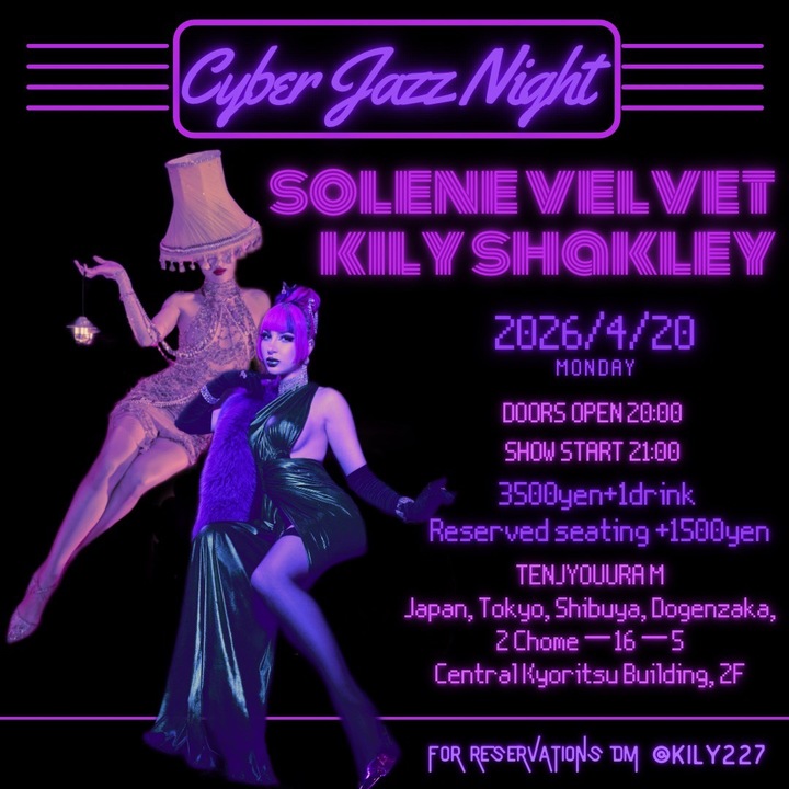 Cyber Jazz Night2026年4月14日|By staff 2026年4月20日 4/20(Mon) Cyber Jazz Night [ Performance ] SOLENE VELVET KILY SHAKLEY [ Time Table ] 20:00 – OPEN 21:00 – SHOW START [ System ] Entrance ¥3500 Reserved Seating +¥1500